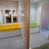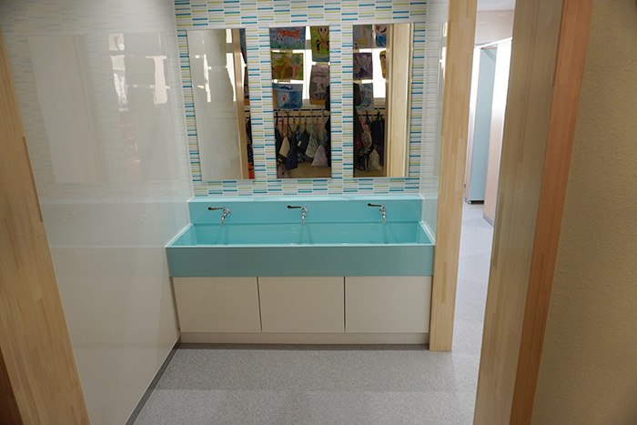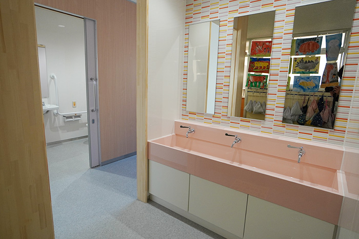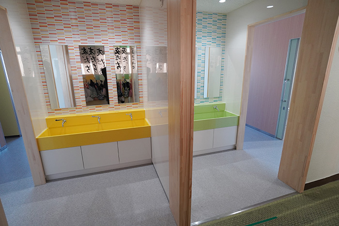 洗面器の色やトイレの扉などをポップでカラフルな色をセレクトし、可愛らしいデザインにしています。各トイレごとに色を変えて変化を持たせています。